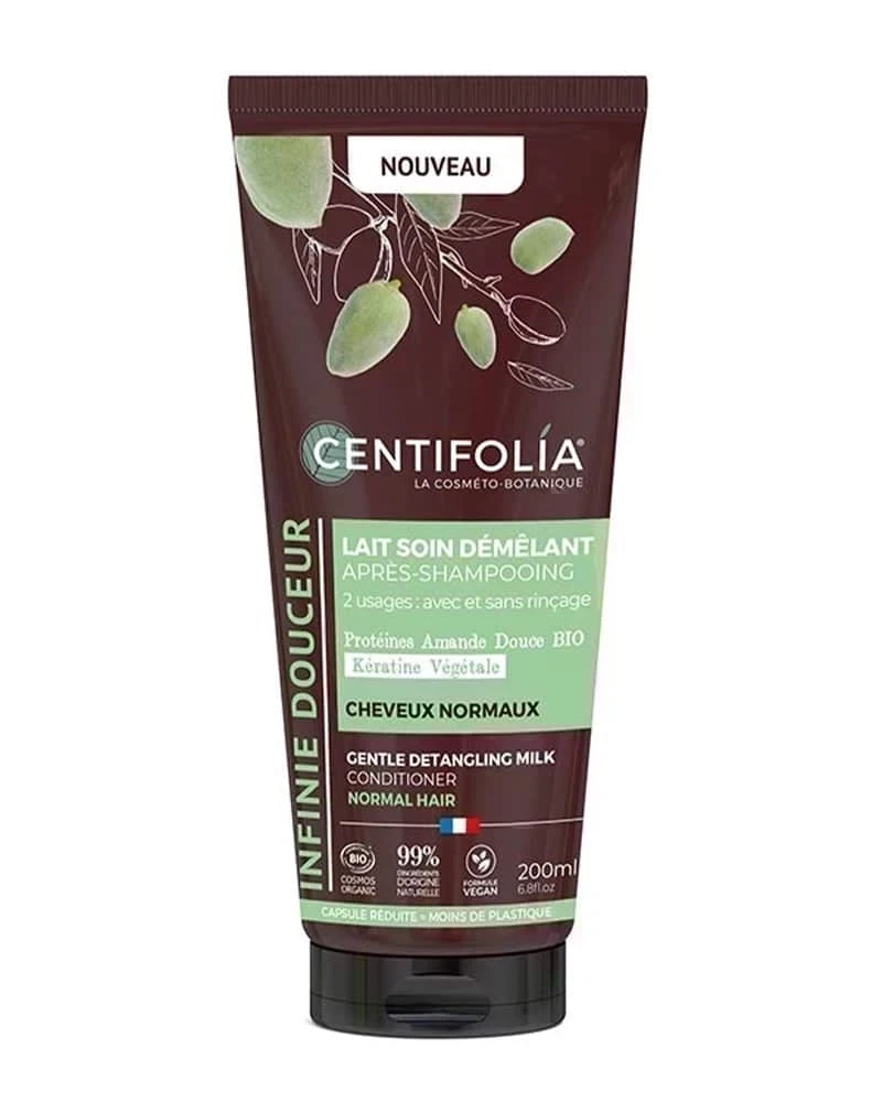Centifolia Lait soin démêlant douceur après-shampoing 200ml BioLe lait soin démêlant douceur après-shampoing 2en1 Centifolia est un produit bio de qualité supérieure qui nourrit et démêle les cheveux en profondeur. Avec sa formule douce et biodégradable, ce soin capillaire est parfaitement adapté pour les cheveux normaux. Enrichi en Protéines d’Amande douce, ce produit facilite le démêlage des cheveux tout en leur apportant douceur et hydratation. La Kératine Végétale, quant à elle, protège la structure interne des cheveux contre les agressions extérieures, ce qui limite l’altération des protéines, constituant majeur de la fibre capillaire. Ce produit apporte également un effet gainant