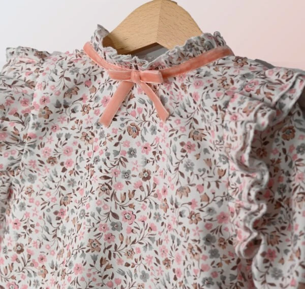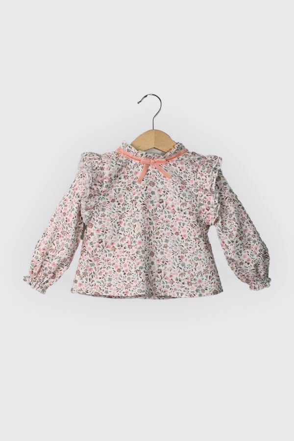 Chemise 100% coton avec détail de volant sur l’épaule . Fermeture boutons sur le dos .