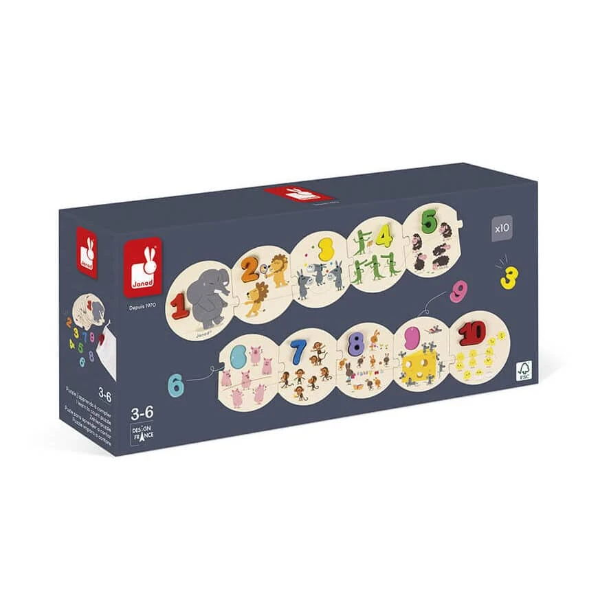 Janod Janod Puzzle J’apprends à compter en boisApprendre à compter est un véritable plaisir quand on le fait en jouant Janod Puzzle J’apprends à compter en bois ! Avec ce puzzle géant, votre enfant dès 3 ans va pouvoir apprendre à compter à son rythme tout en reconstituant un puzzle en carton de 10 pièces. Chaque pièce du puzzle correspond à un chiffre en bois qu’il faut replacer au bon endroit, pour apprendre à compter jusqu’à 10 ! Et pour s’enrichir en bonne compagnie, des animaux rigolos sont représentés sur les pièces : sauras-tu les compter jusqu’au bout ? Un