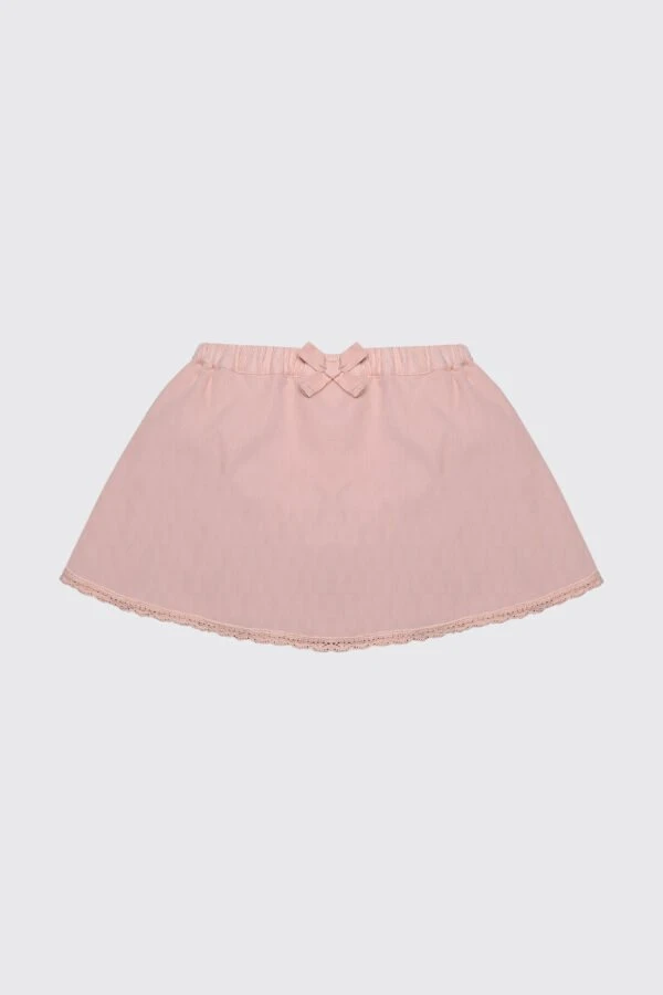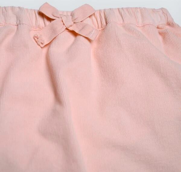 Jupe cloche rose pale en velour cotelé à petites rayures ornée d’un noeud devant et d’un ruban macramé en bas. Un bloomer est inclu dans la jupe pour les bébés filles