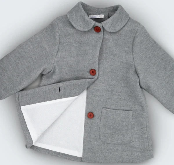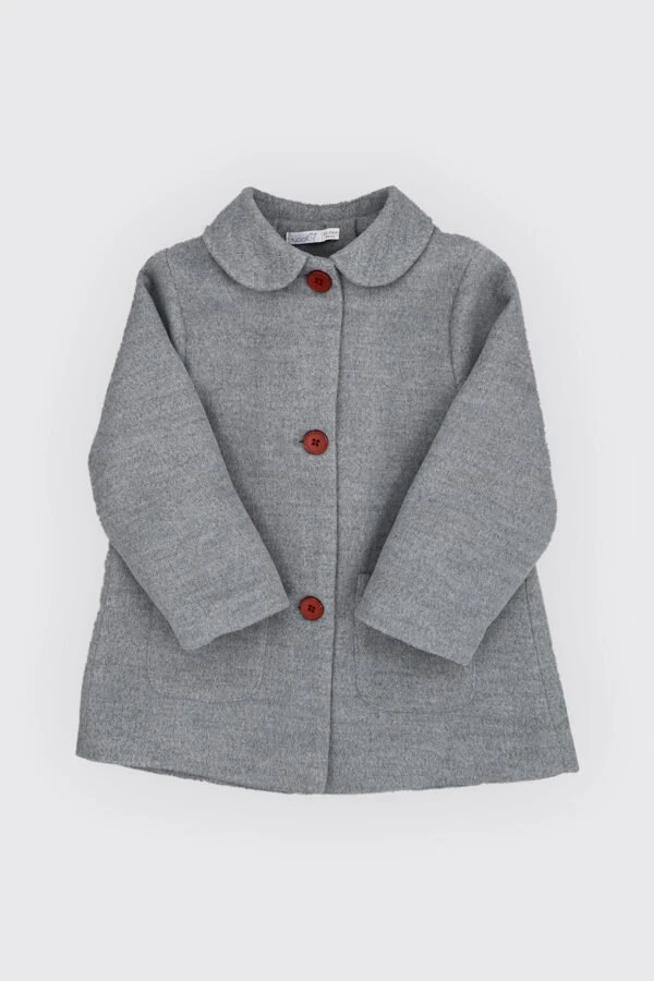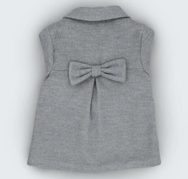 Manteau gris pour bébé fille avec un col claudine, des boutons bordeaux sur le devant et un nœud décoratif sur le dos est à la fois fonctionnel et élégant, parfait pour tenir votre bébé au chaud tout en la faisant briller avec style.