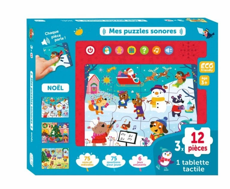 Un puzzle sonore Auzou pour découvrir la magie de Noël 🎅 Le livre Mes Puzzles Sonores 12 Pièces – Noël signé Auzou est une belle invitation à explorer l’univers féérique des fêtes. Grâce à ses illustrations colorées et ses sons de Noël enchanteurs, votre enfant s’émerveille en reconstituant chaque scène du puzzle tout en écoutant les mélodies emblématiques de cette période magique. 🎄 Conçu pour les petites mains dès 3 ans, ce puzzle sonore éducatif allie plaisir, apprentissage et éveil sensoriel : une idée cadeau parfaite pour partager un moment complice avant les fêtes !Les points forts du puzzle sonore