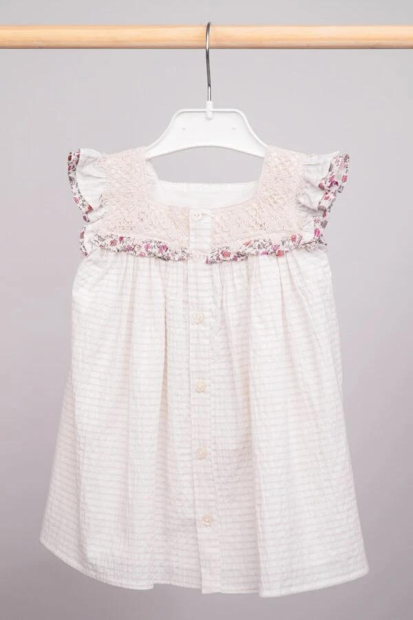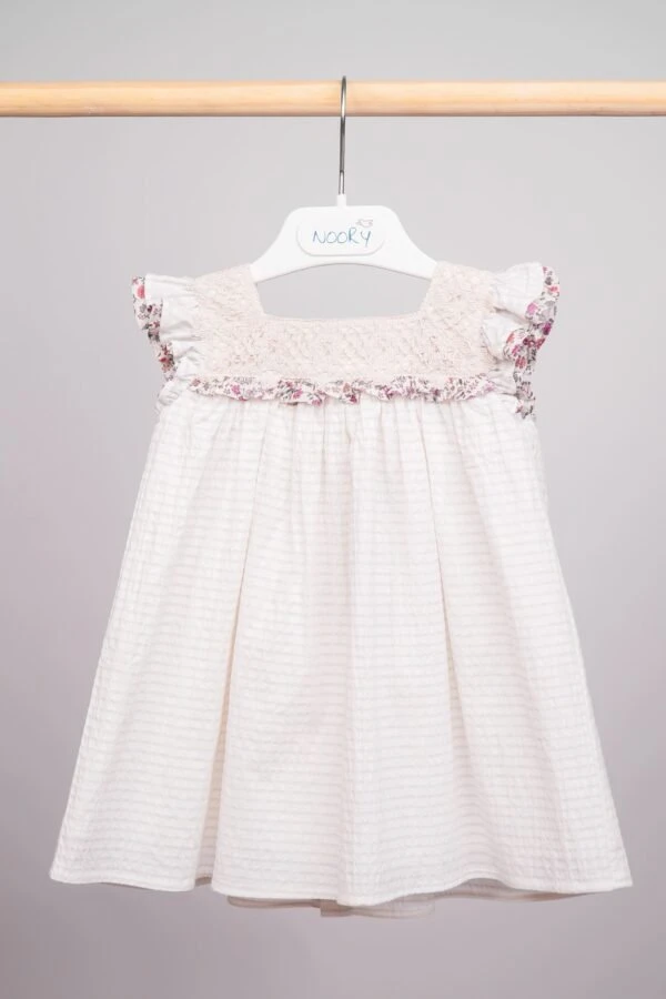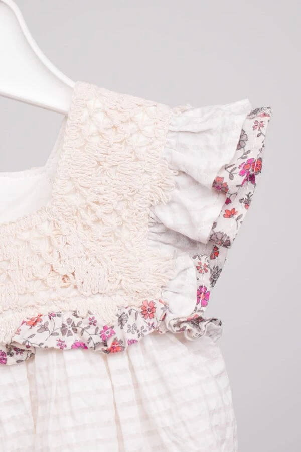 Cette robe pour bébé fille, avec ses petites manches volantées, son empiècement en macramé délicat et ses volants contrastés qui mettent en valeur les manches et le haut, est un véritable coup de cœur. Le petit patch en forme de cœur en bas ajoute une touche adorable. Accompagnée d’un bloomer à jambes volantées, c’est le duo parfait pour une petite fille au style plein de charme !