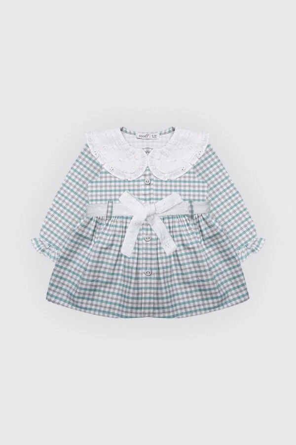 Robe en tissu 100% coton à carreaux. Son col large en broderie anglaise, apporte une touche de romantisme et de délicatesse à l’ensemble.