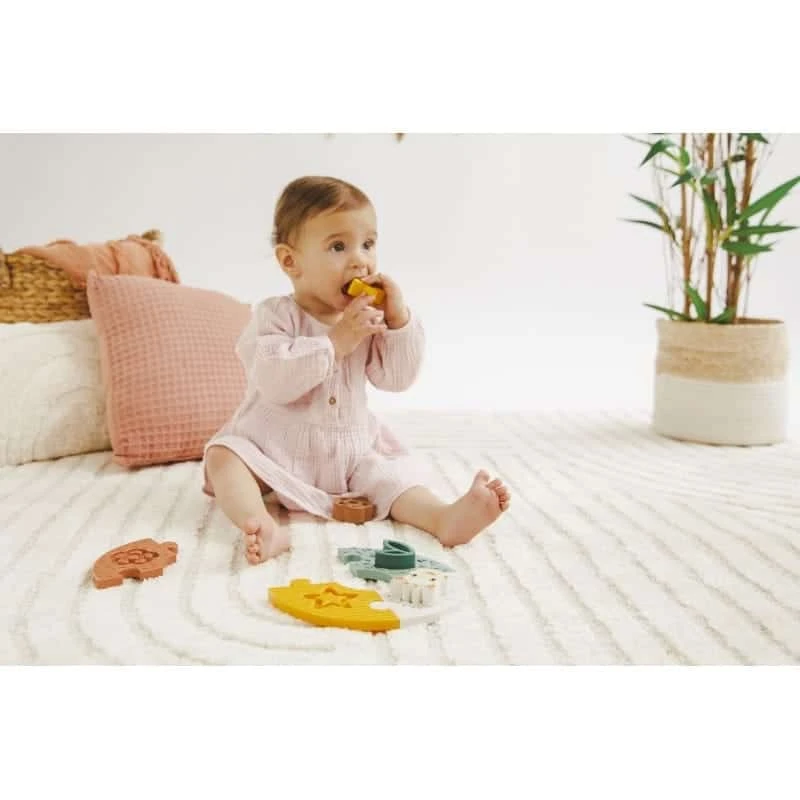 Sophie la Girafe – Mon Premier Puzzle Éducatif & Sensoriel BébéUn puzzle pour stimuler la motricité dès le plus jeune âge Conçu spécialement pour accompagner les premières découvertes de bébé, Mon Premier Puzzle Sophie la Girafe allie jeu éducatif et éveil sensoriel. Il se compose de 8 pièces : 4 pièces de puzzle en bois faciles à manipuler et 4 formes à encastrer en caoutchouc 100% naturel, issues de la sève d’hévéa. Ce jouet 2-en-1 favorise la coordination œil-main, la motricité fine et la curiosité naturelle des tout-petits.Les atouts de Mon Premier Puzzle Sophie la Girafe🧩 Développement de la coordination